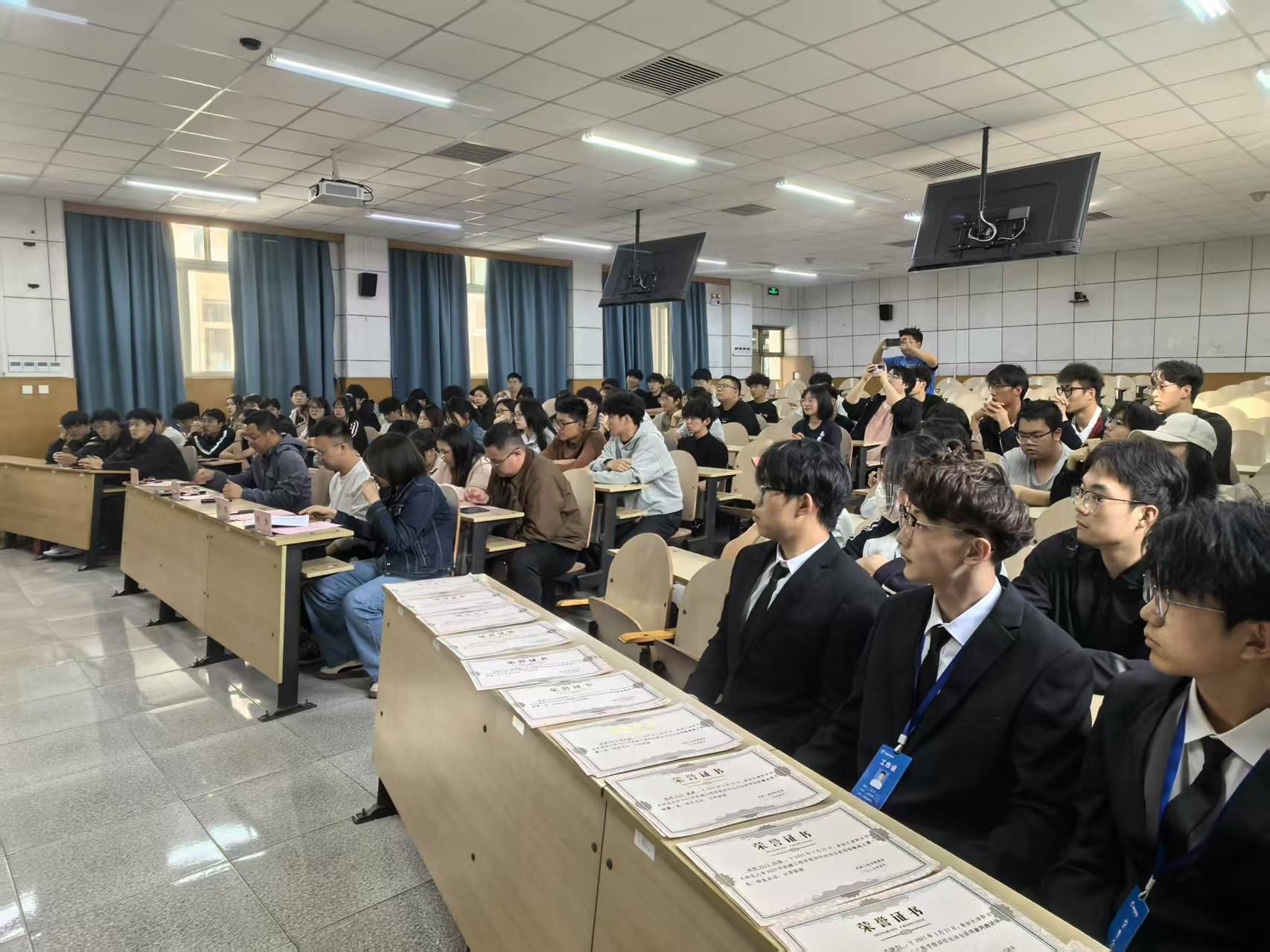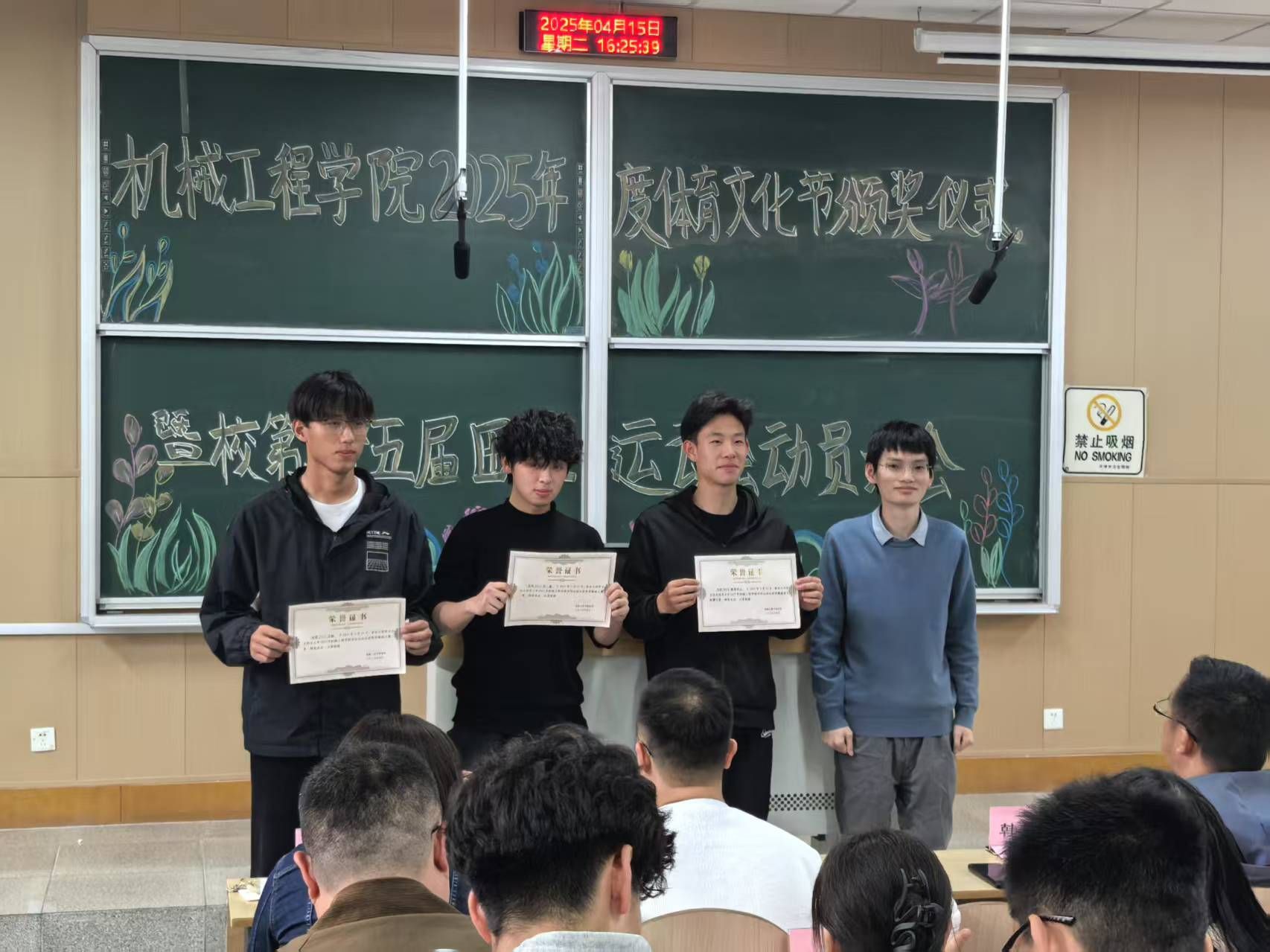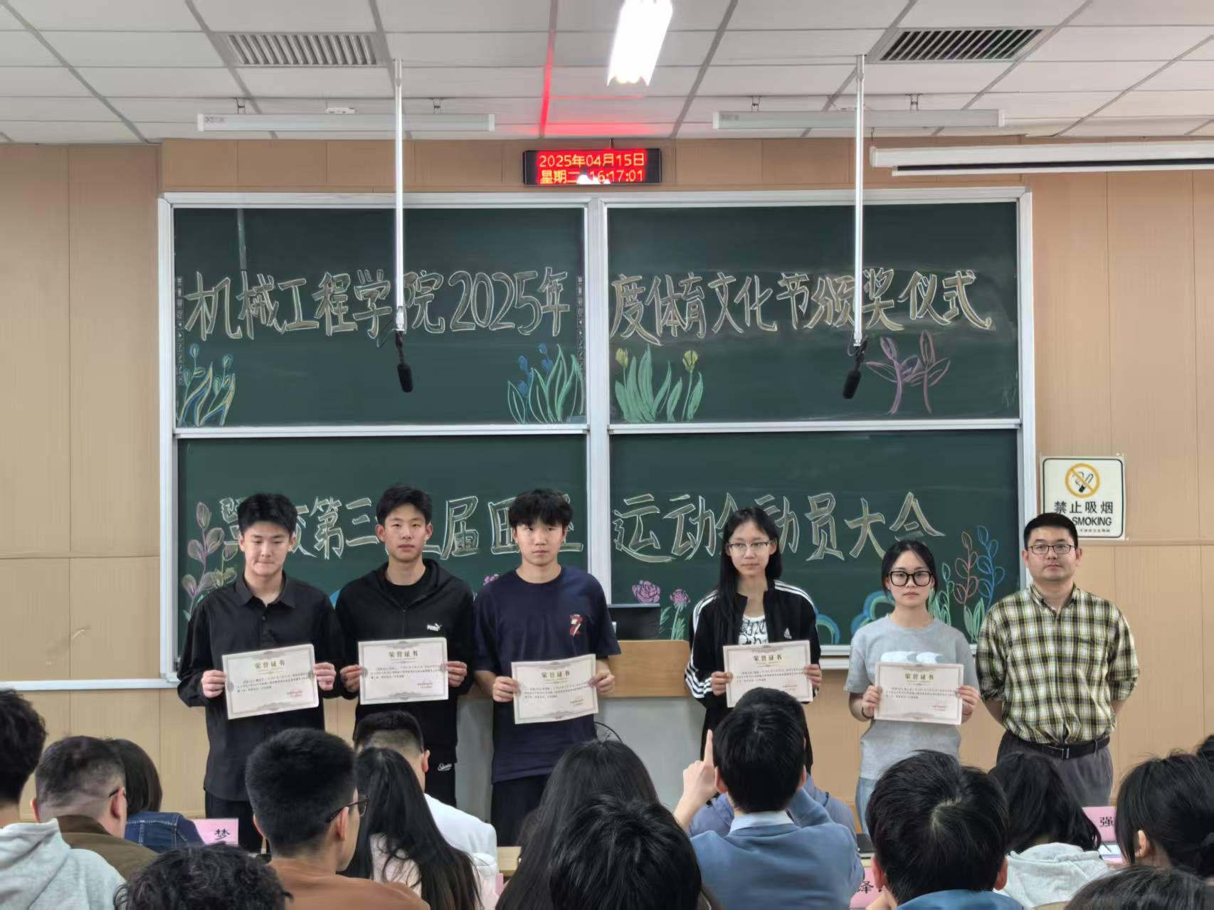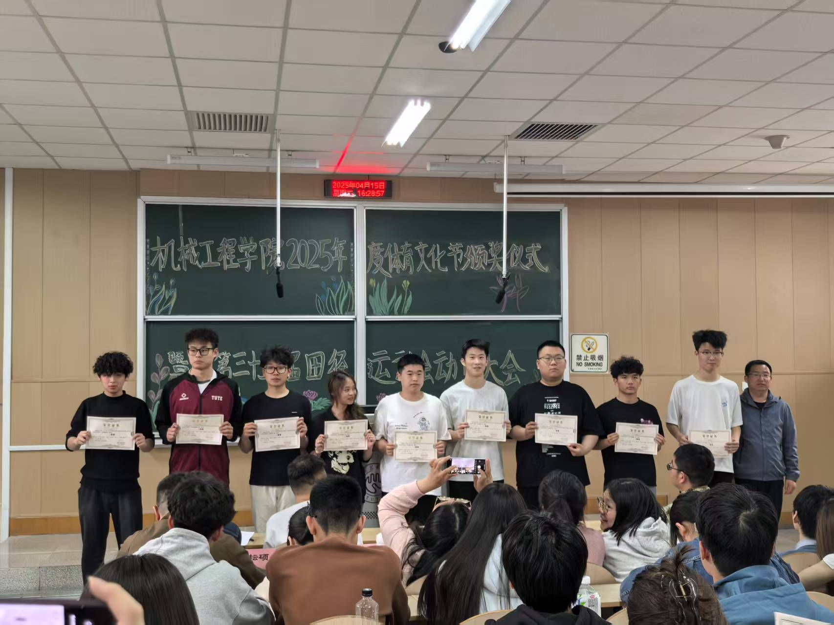 预会教员为教院拔河角逐获奖的9个班级代替战教院田径活动会获奖的103实活动员顺次发表获奖文凭。